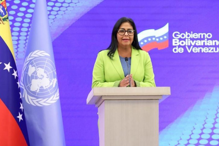 Durante su intervención, la vicepresidente Delcy Rodríguez recordó que la nación sudamericana resultó blanco de más de 430 sanciones contra la economía, el comercio y el sector financiero, contra todo principio jurídico de inmunidad soberana.