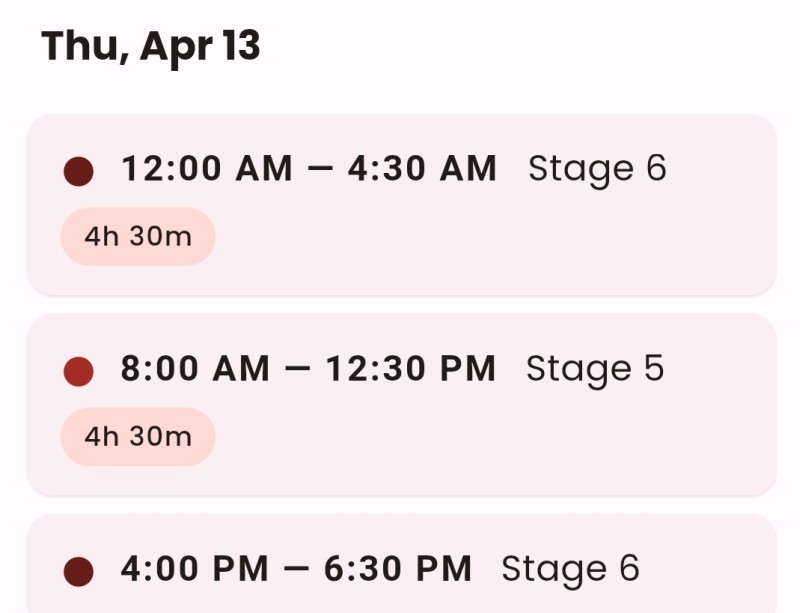 Eskom dice que ese patrón de alternar los programas de ahorro se repetirá diariamente hasta nuevo aviso.