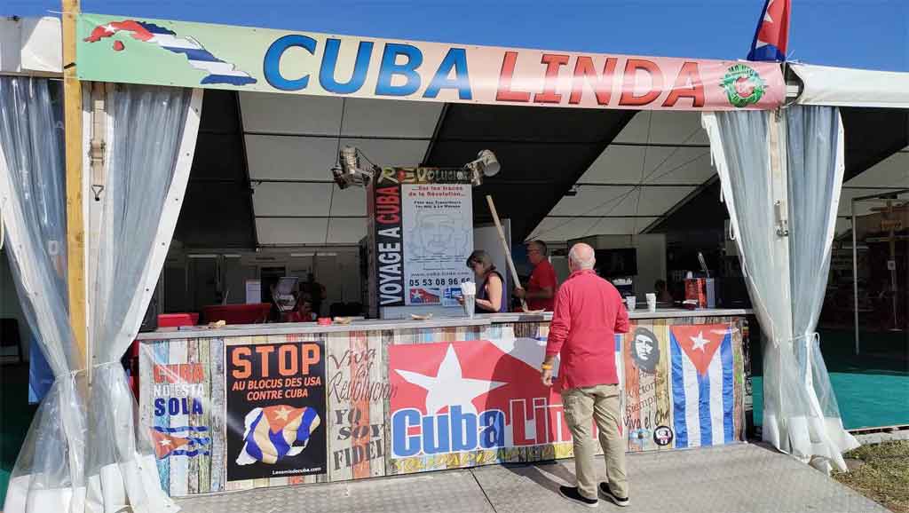 La bandera de la estrella solitaria, pancartas que exigen el fin del cerco económico, comercial y financiero contra la isla y la imagen del eterno guerrillero Ernesto Che Guevara dominan varios estands en el evento de tres días, organizado por segundo año consecutivo en la antigua base aérea de Plessis-Paté, en el departamento de Essonne.